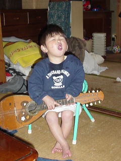 この画面では見えないがフルチン。シャツはよだれで濡れている。ちなみに手に持っているのは粗大ごみの日に拾ったマンドリン。